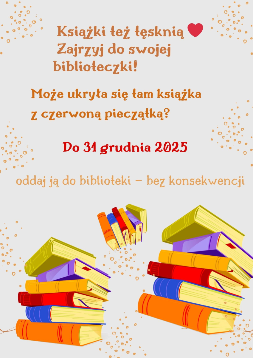 Przedświąteczne porządki to idealny moment, by zajrzeć do swoich domowych biblioteczek. Może gdzieś na półce, w kartonie albo na dnie szuflady zawieruszyła się książka z czerwoną pieczątką naszej biblioteki?